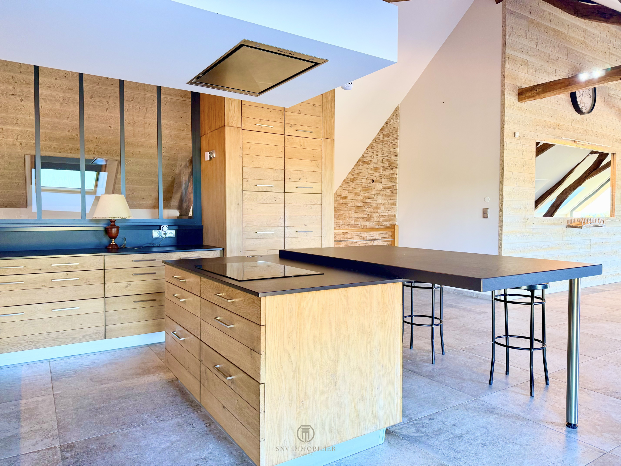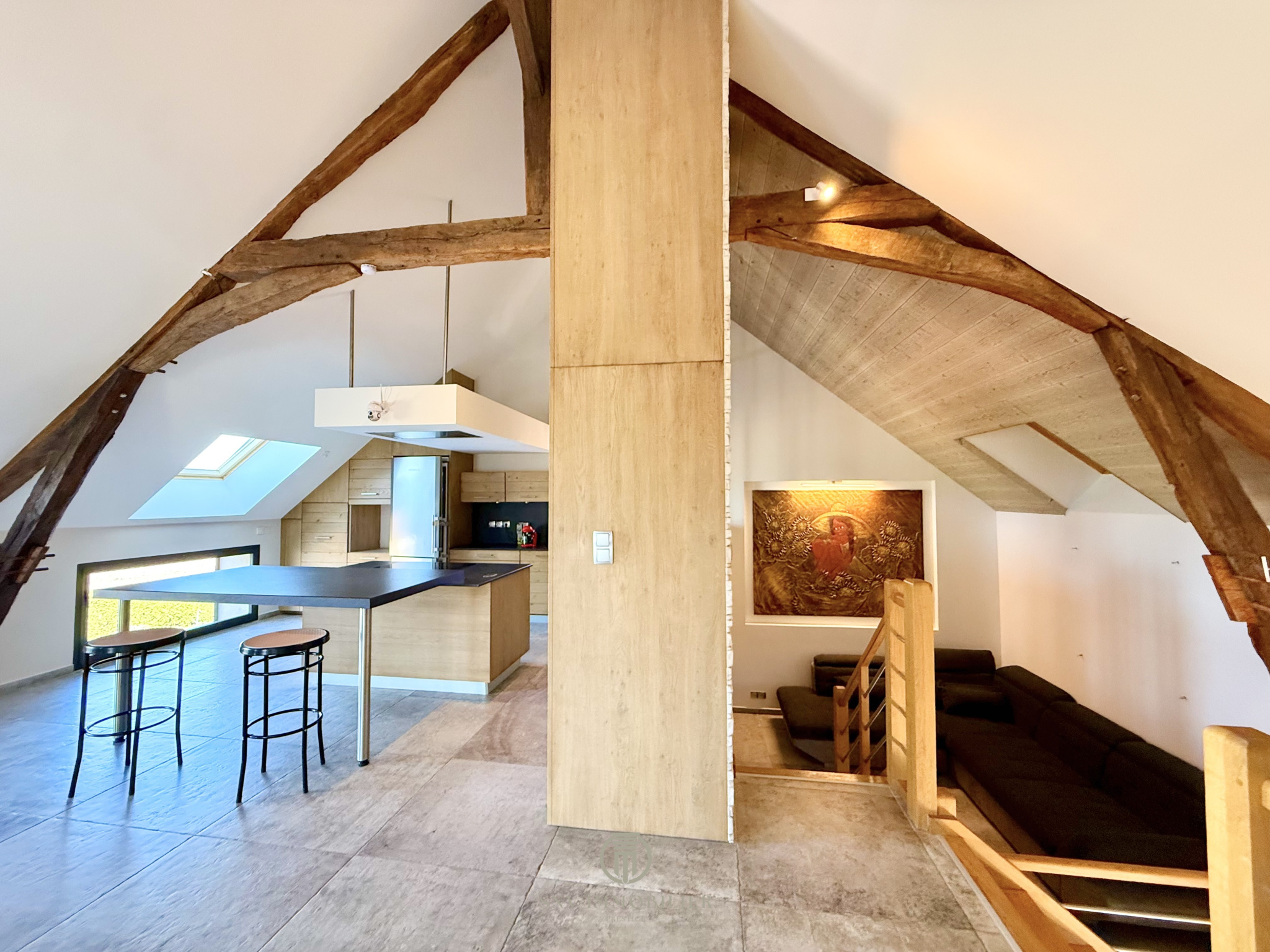 - une grande pièce de 70 m2 ouverte avec charpente chevillée apparente donnant sur cuisine et son ilot ainsi qu'un balcon de 28 m2.