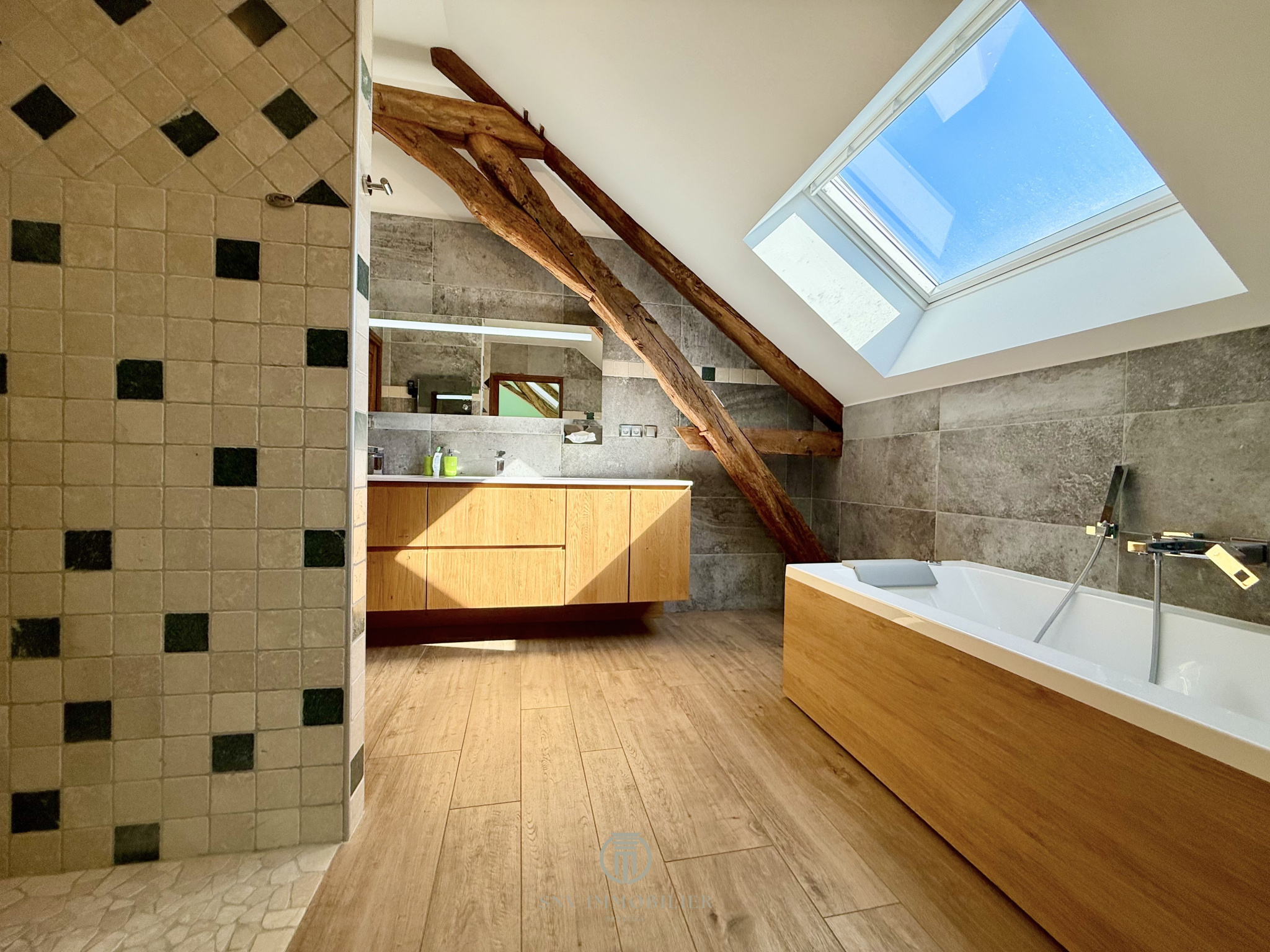 - une salle d'eau très spacieuse avec douche et meuble vasque