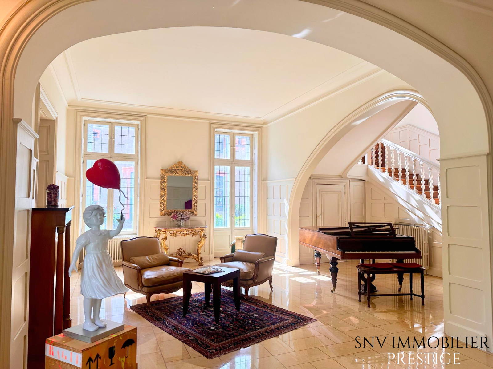 - Un salon avec cheminée en marbre, parquet Versailles et accès direct à la terrasse avec vue sur la fontaine et le parc arboré