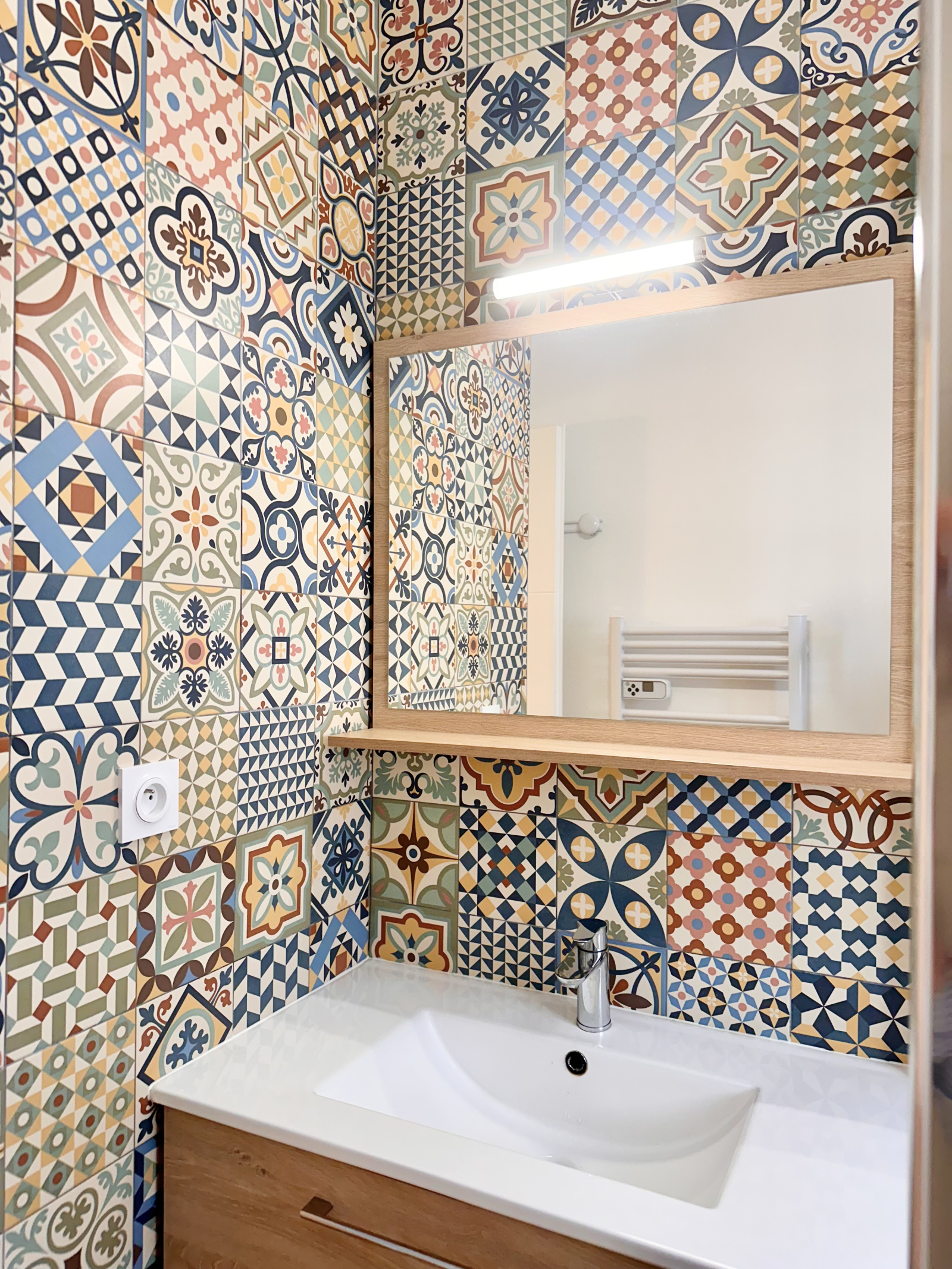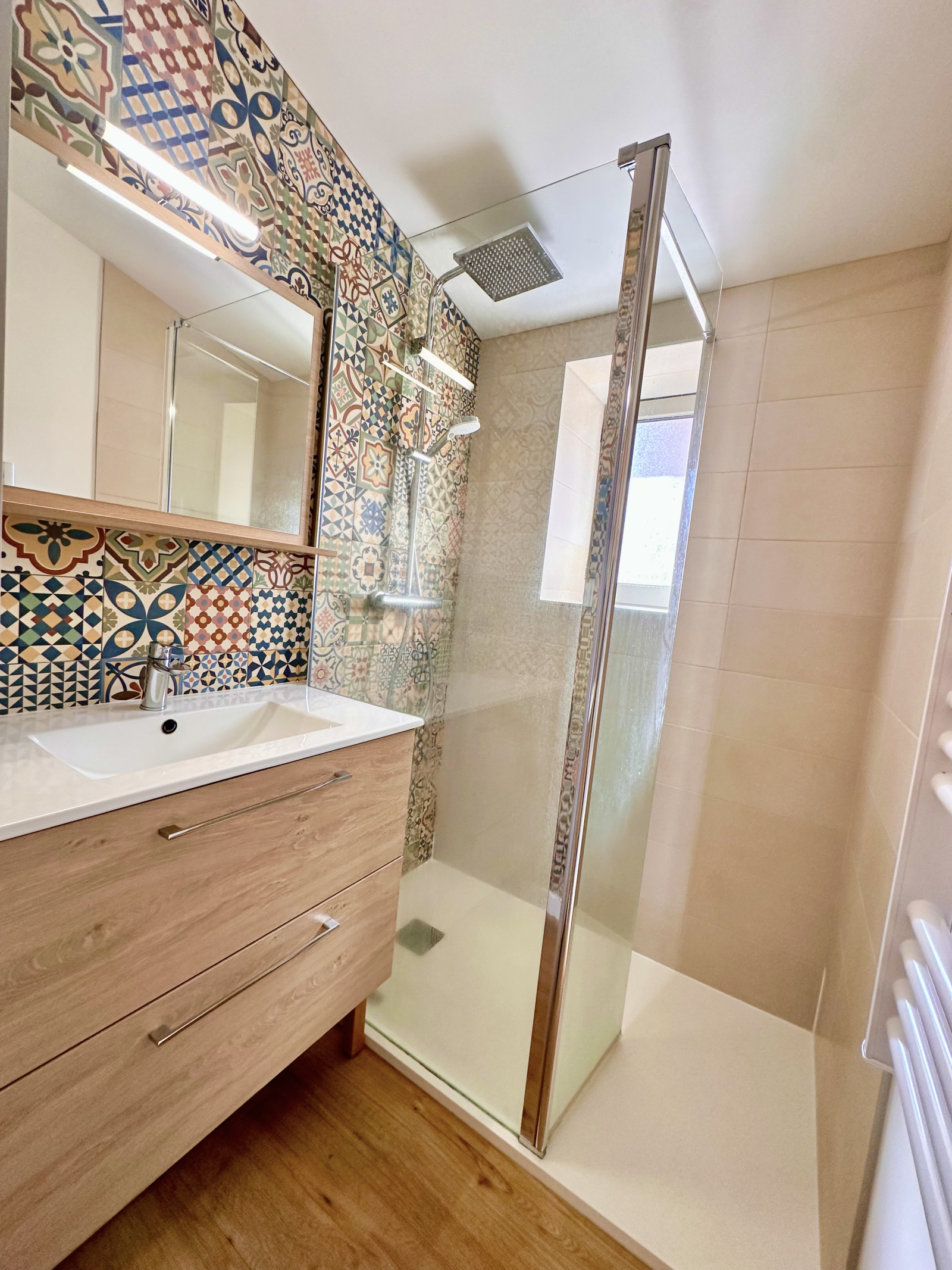 * une salle d'eau avec douche à l'italienne et meuble vasque