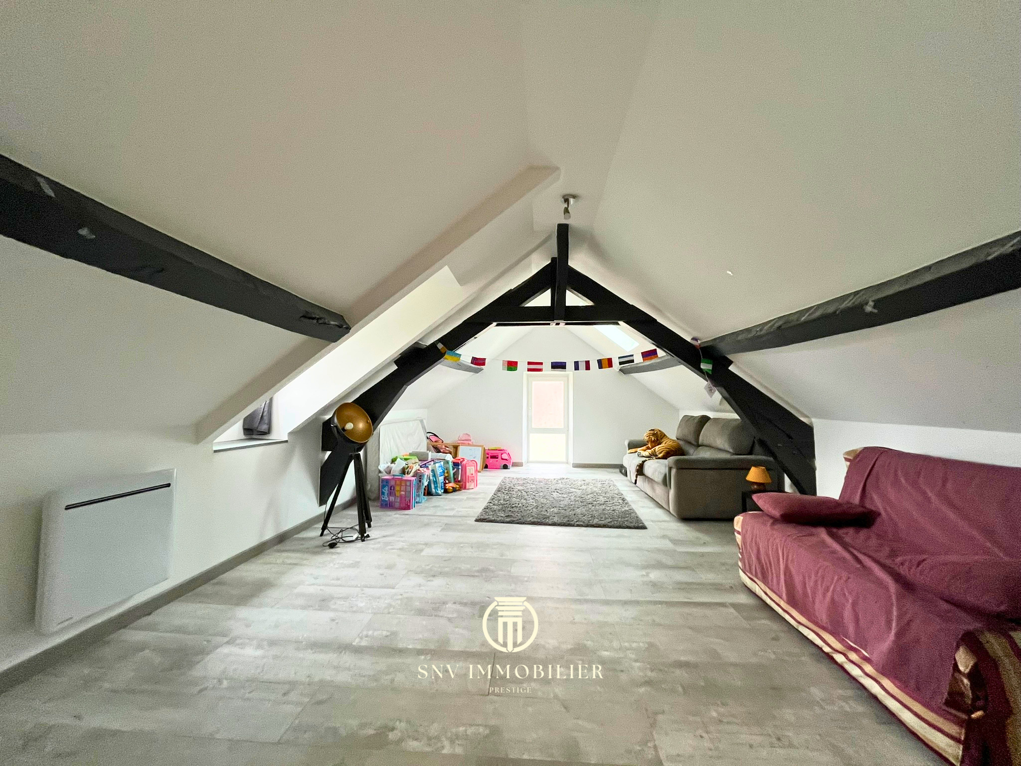 - Superbe pièce de vie avec cuisine équipée haut de gamme, ouverte sur un vaste salon / salle à manger sous plafond cathédral avec poutres apparentes