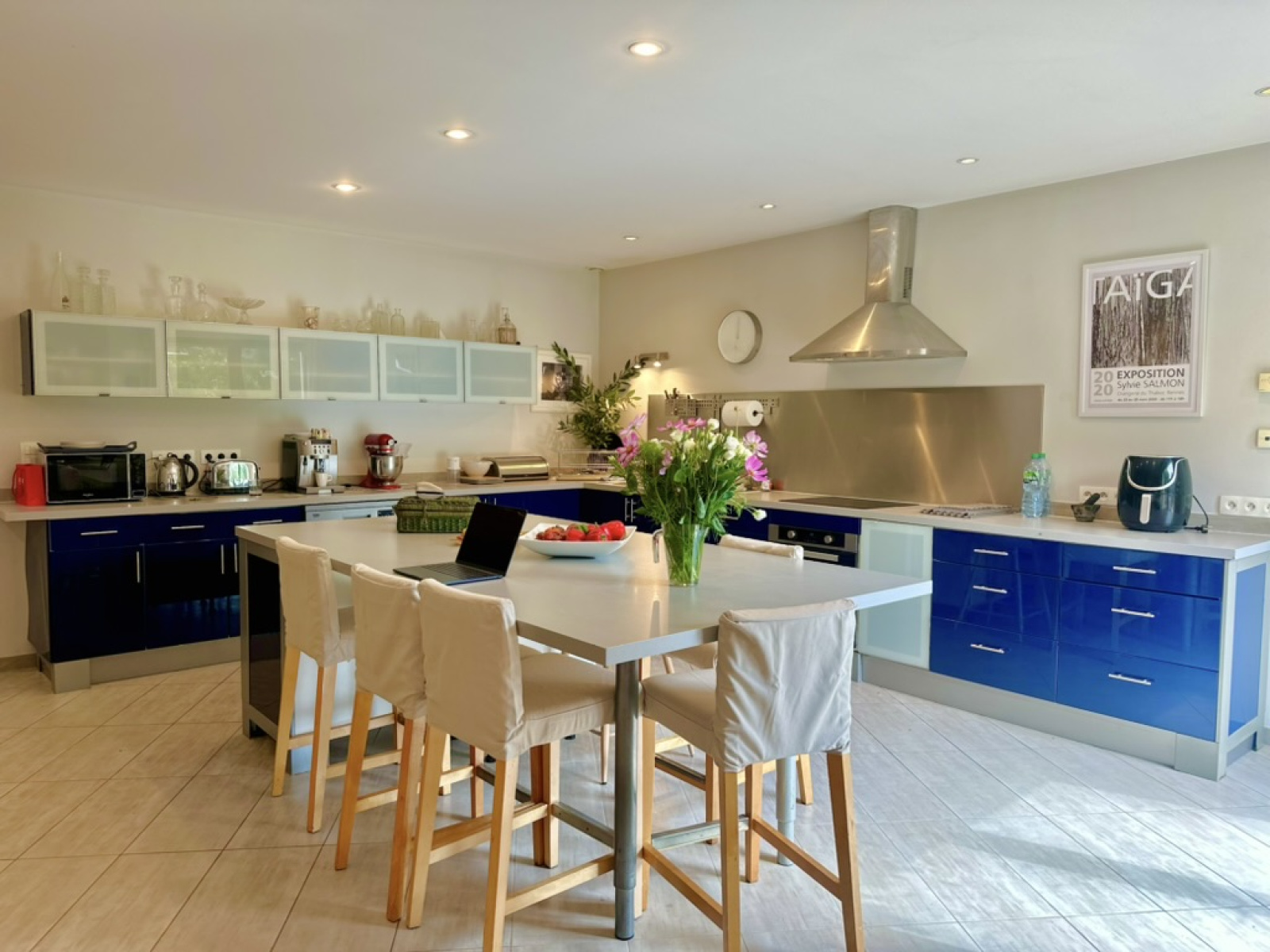 - Une cuisine américaine équipée avec son ilot central ouverte sur le salon-séjour permettant un accès aux différentes terrasses de la maison et accès à la piscine fermée