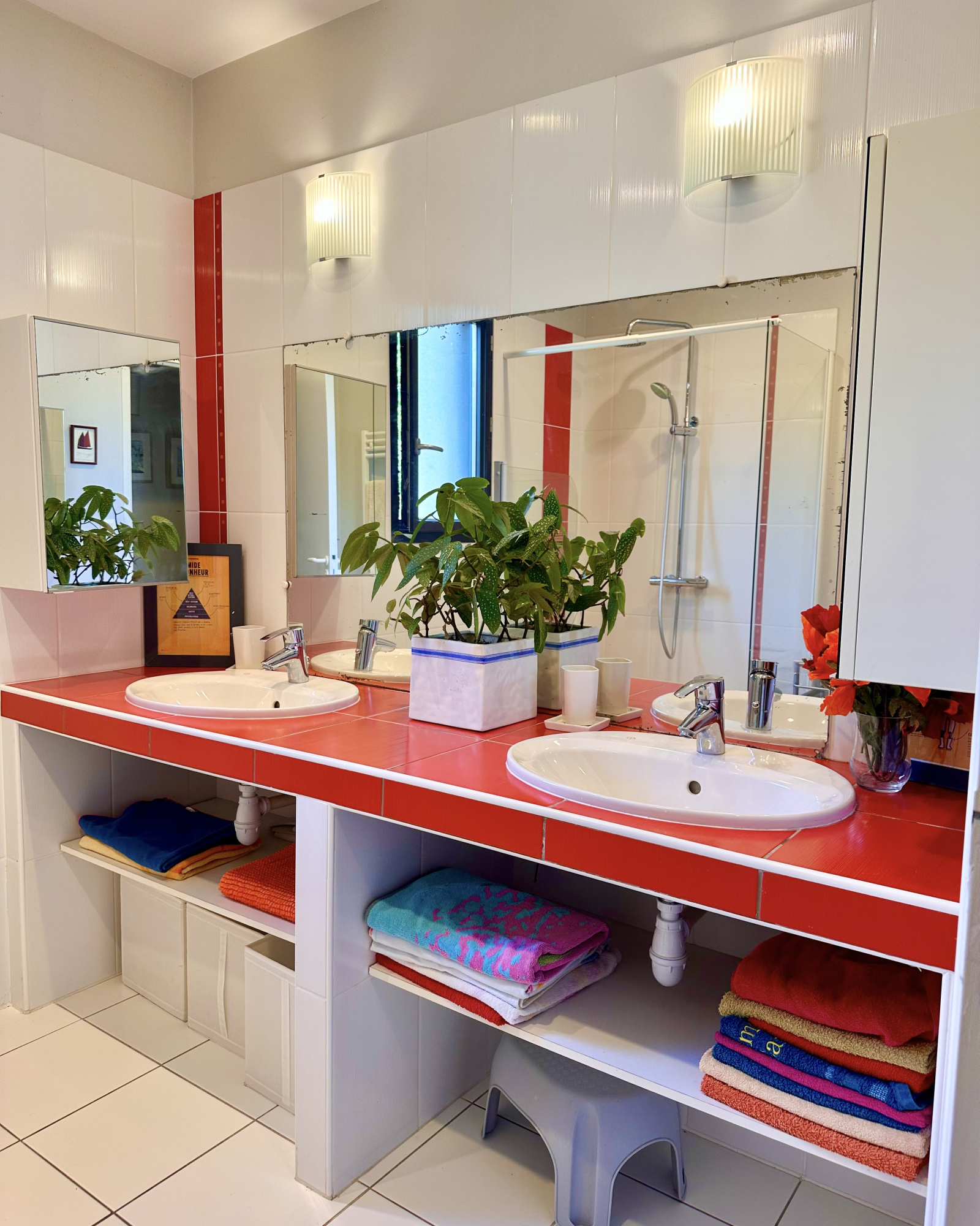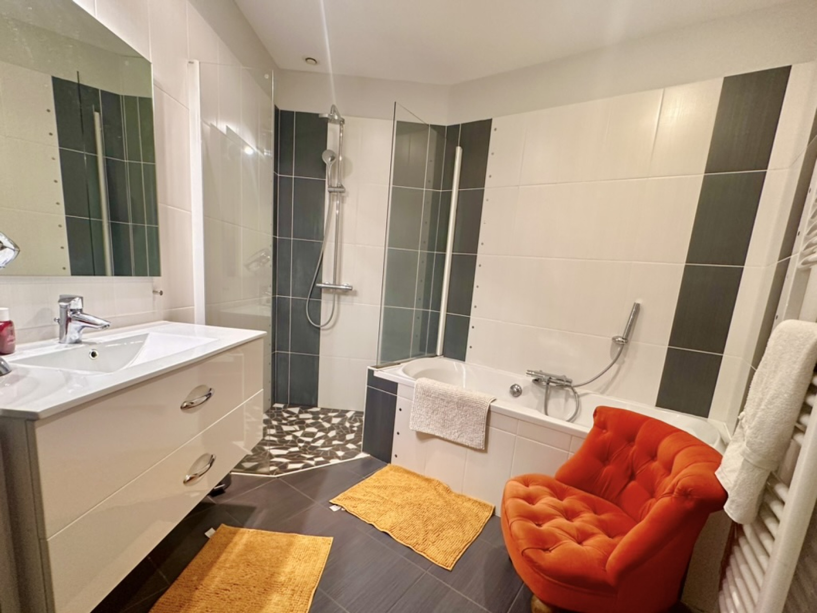 - Une salle d'eau spacieuse avec douche à l'italienne et meuble double vasque