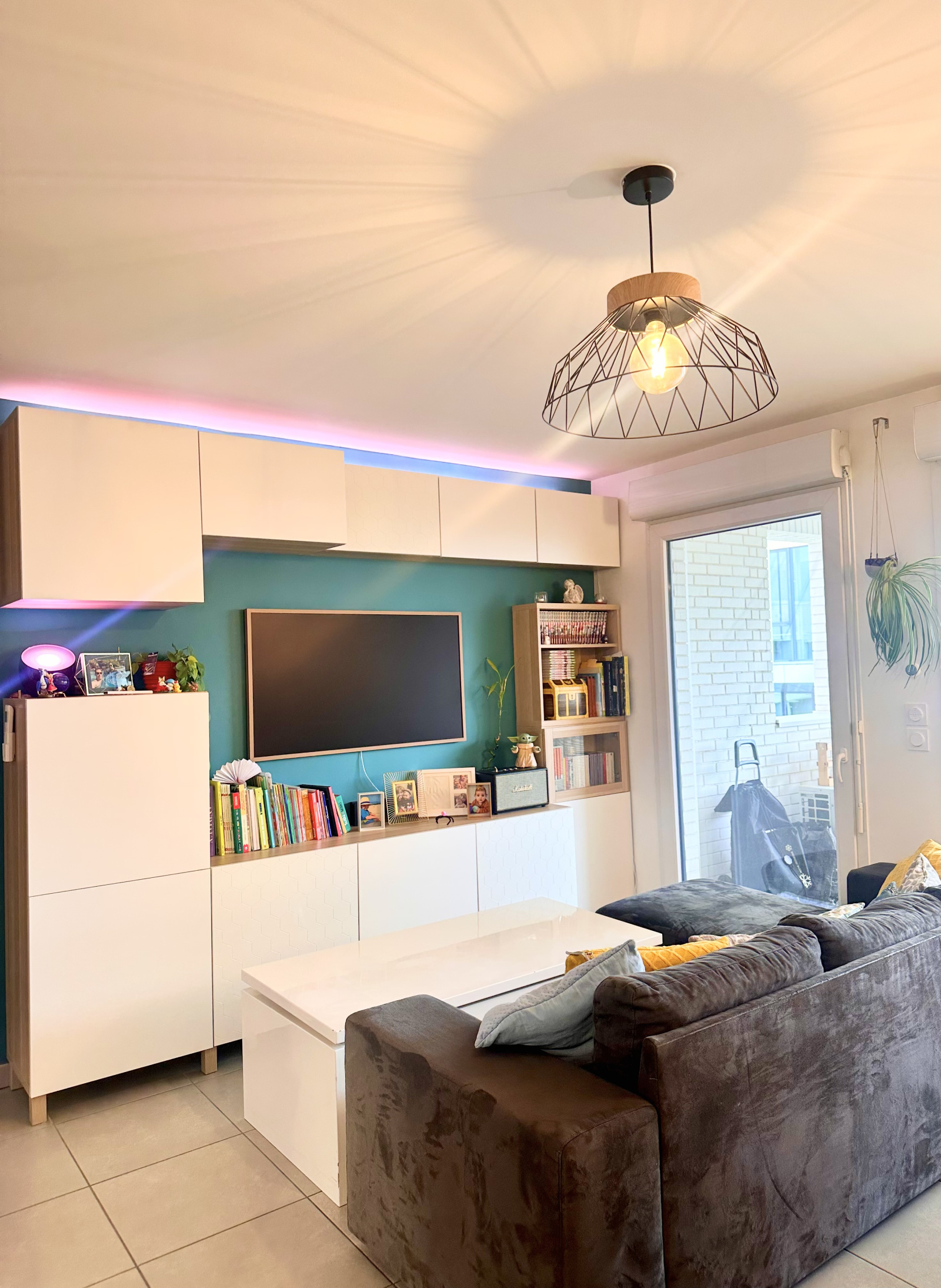 - un salon / séjour ouvert sur la cuisine entièrement équipée avec une exposition à l’est et donnant sur une loggia couverte vue sur le jardin privatif de la résidence