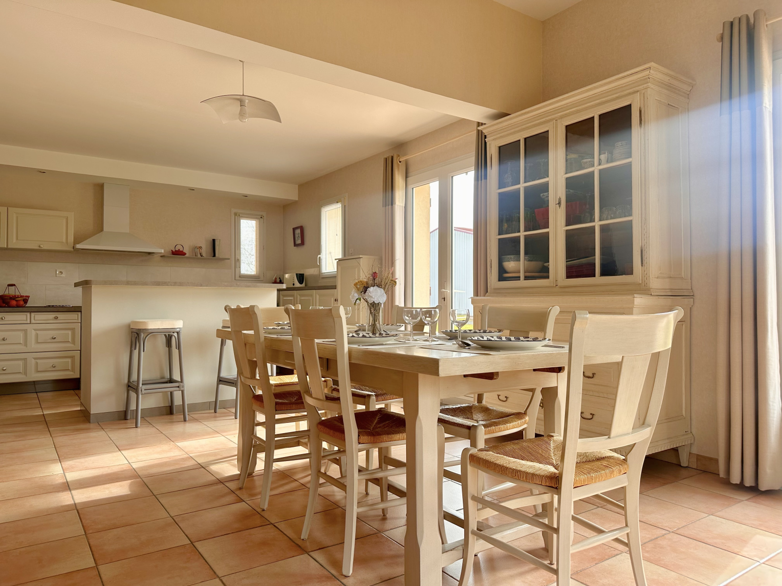 - un couloir menant à la pièce de vie entièrement ouverte avec sa cuisine équipée et son ilot central, la salle à manger et le salon avec une belle cheminée, l'ensemble de cette pièce de vie permet par les différentes portes fenêtres d'accéder à la terrasse bénéficiant d'un store banne motorisé