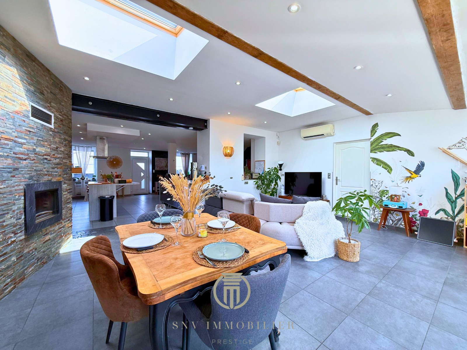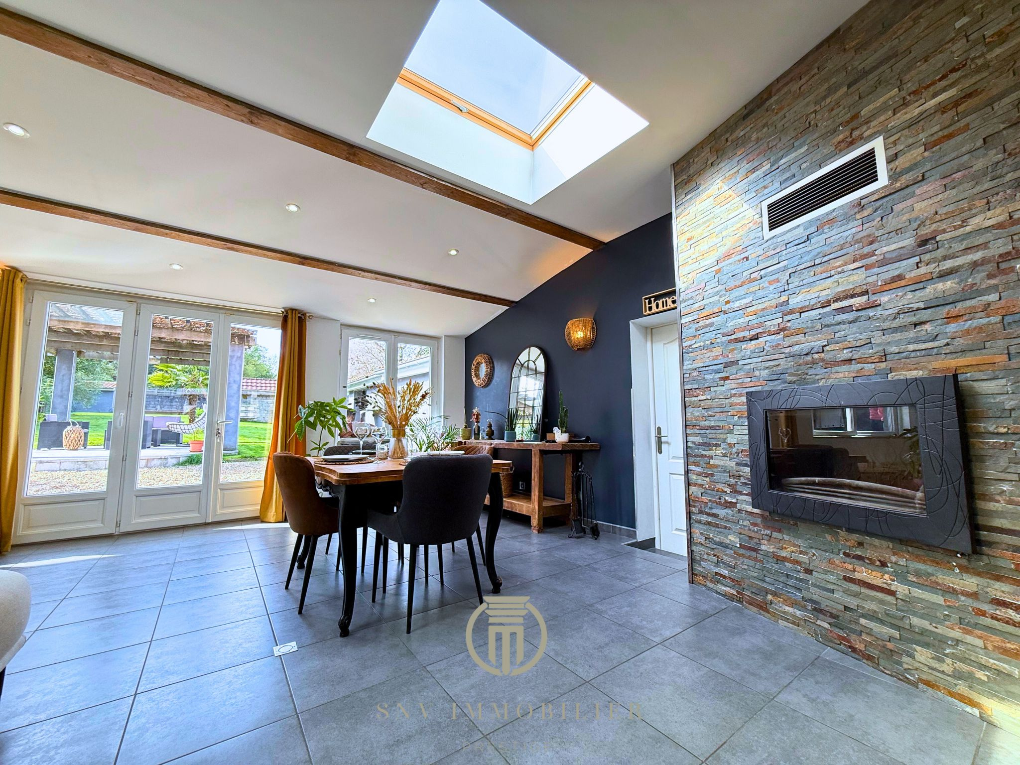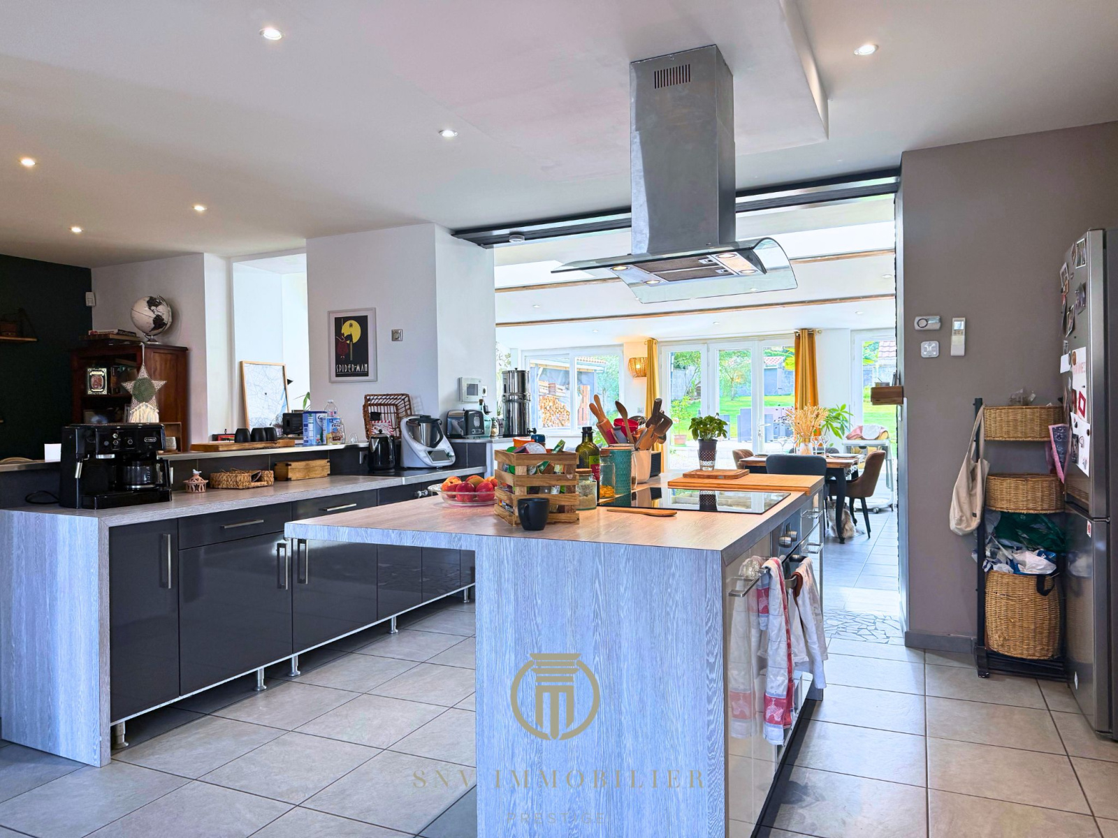 - Une cuisine équipée avec un grand plan de travail et ouvert sur le salon / salle à manger vue sur le jardin avec clim réversible et une cheminée.