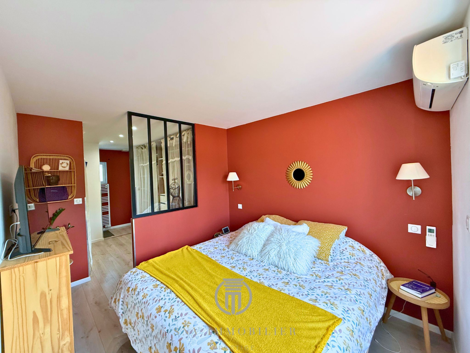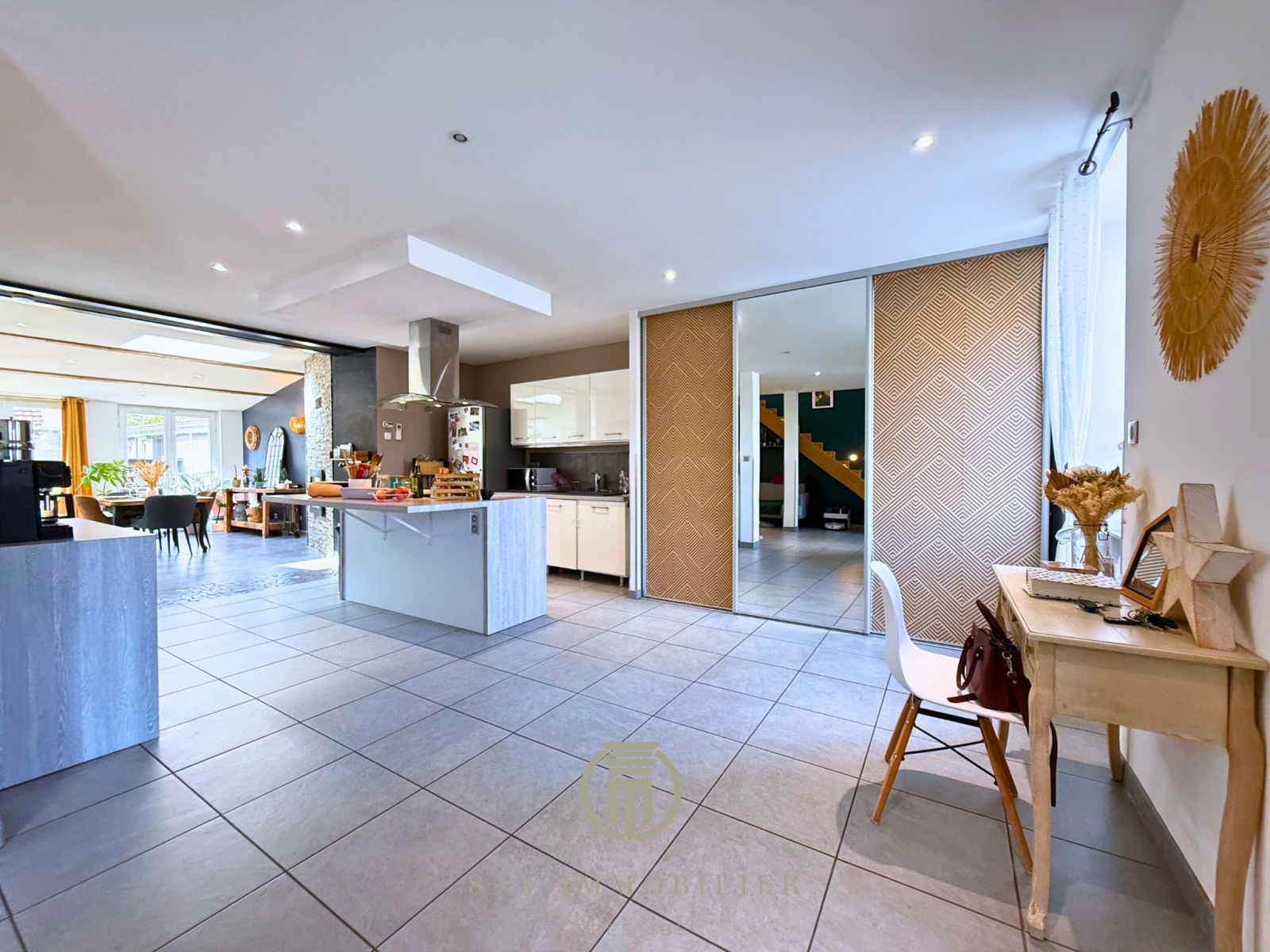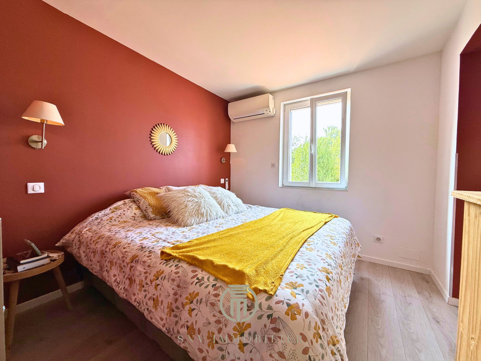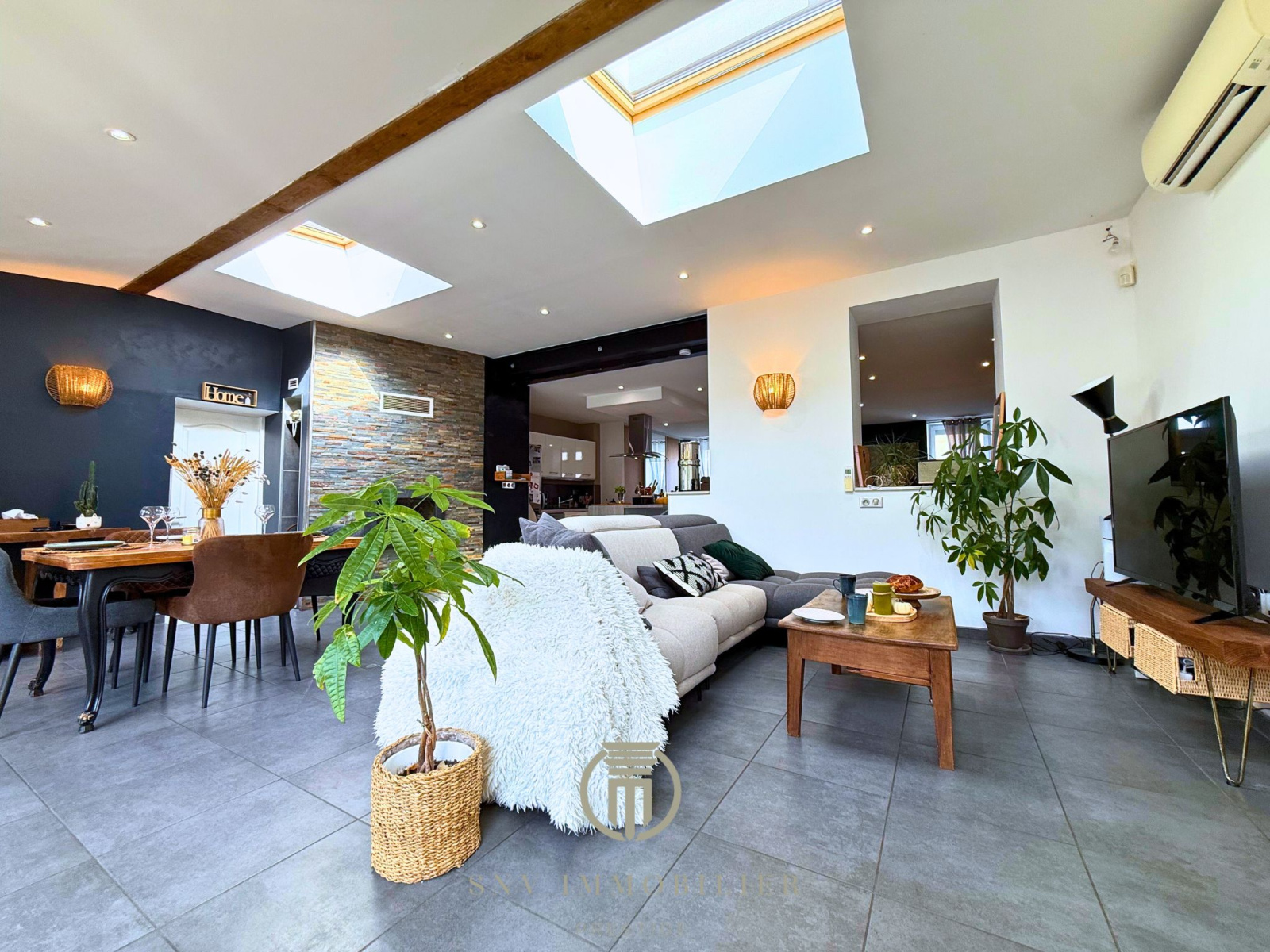 - Une cuisine équipée avec un grand plan de travail et ouvert sur le salon / salle à manger vue sur le jardin avec clim réversible et une cheminée.