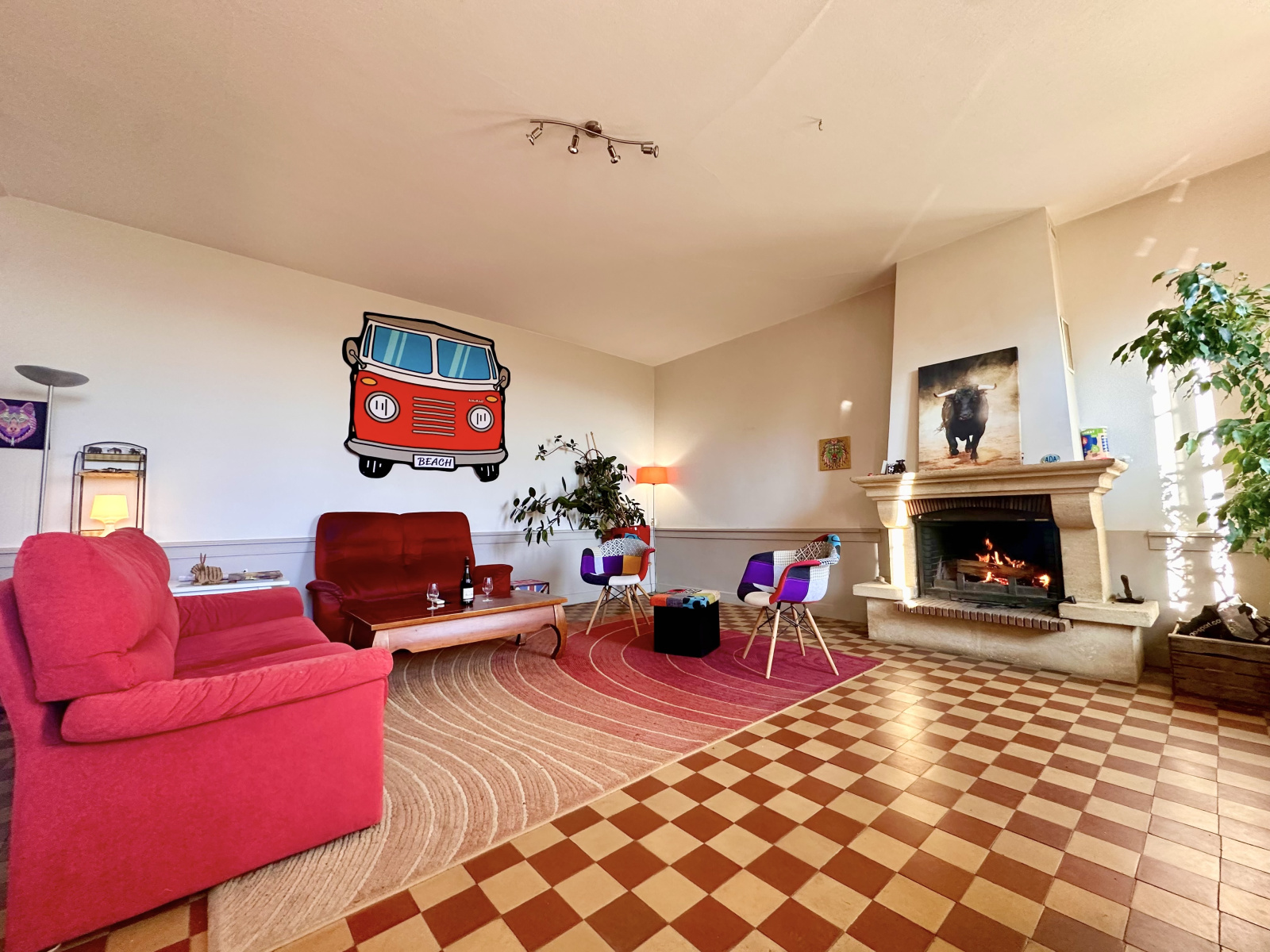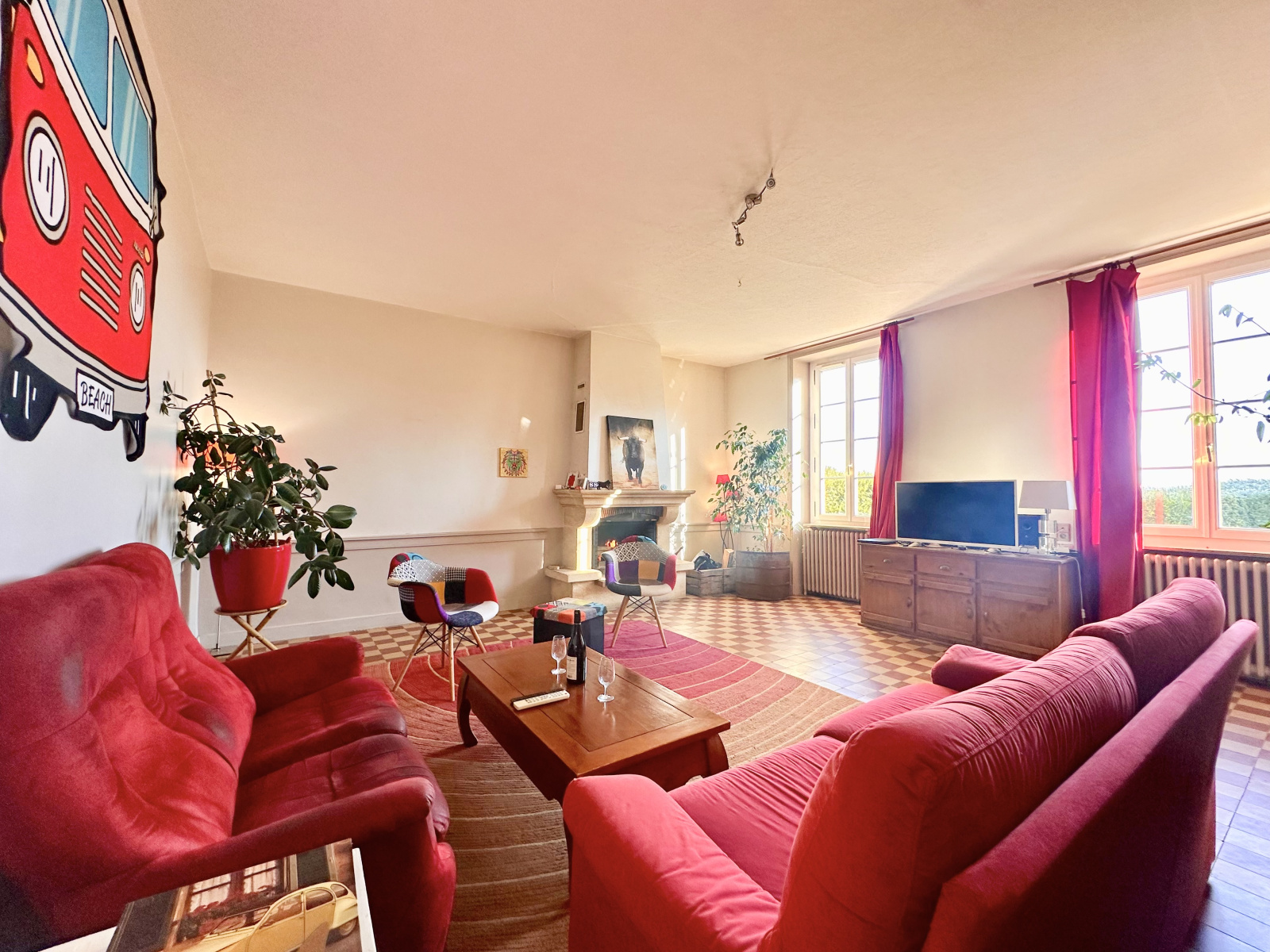 - un grand salon avec une belle hauteur sous plafond ainsi qu'une cheminée