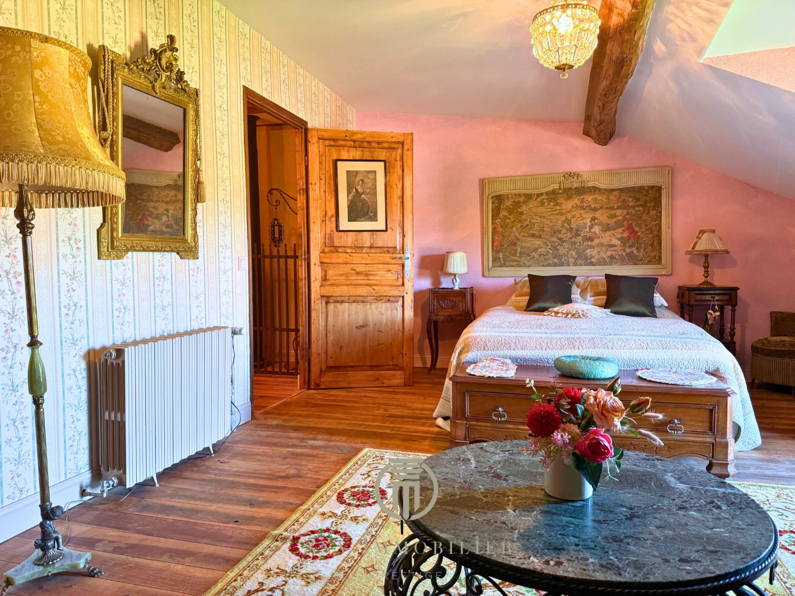 - une maison style corps de ferme rénovée avec soin et des matiériaux nobles comme la pierre, le fer forgé et poutres apparentes dans un style proche du Baroque et Rococo.