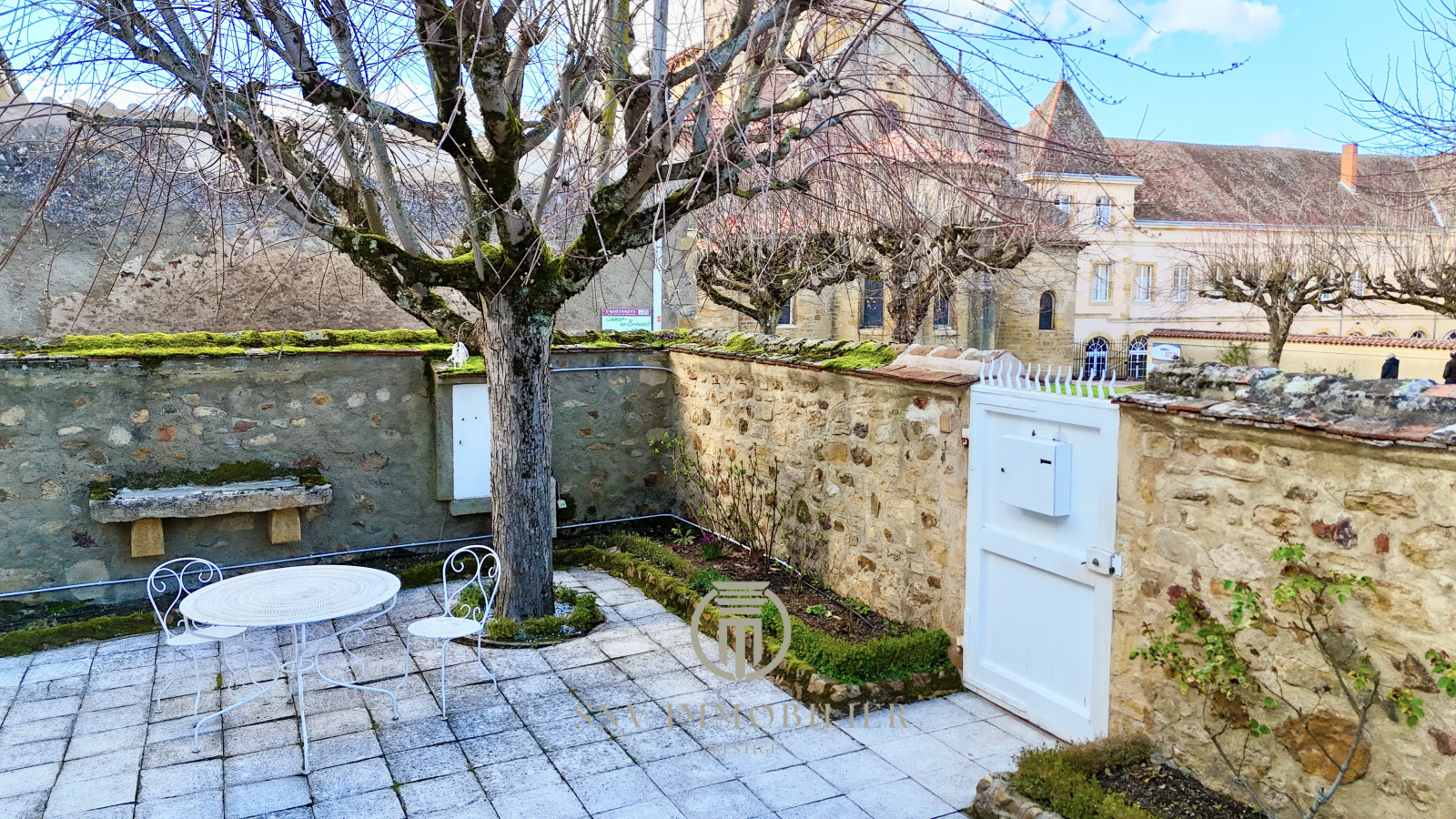 - on retrouve une première cour / terrasse arborée (ouverture avec portail motorisé et porte piétonne) avec vue sur les plus beaux monuments de la commune : le château Saint Hugues, la Mairie, la collégiale Sainte Hilaire et biens d'autres