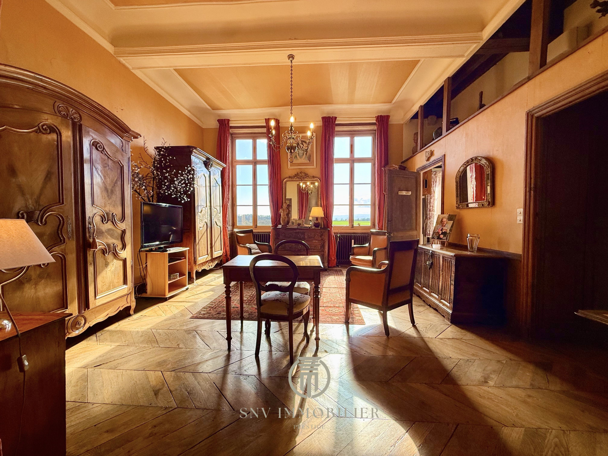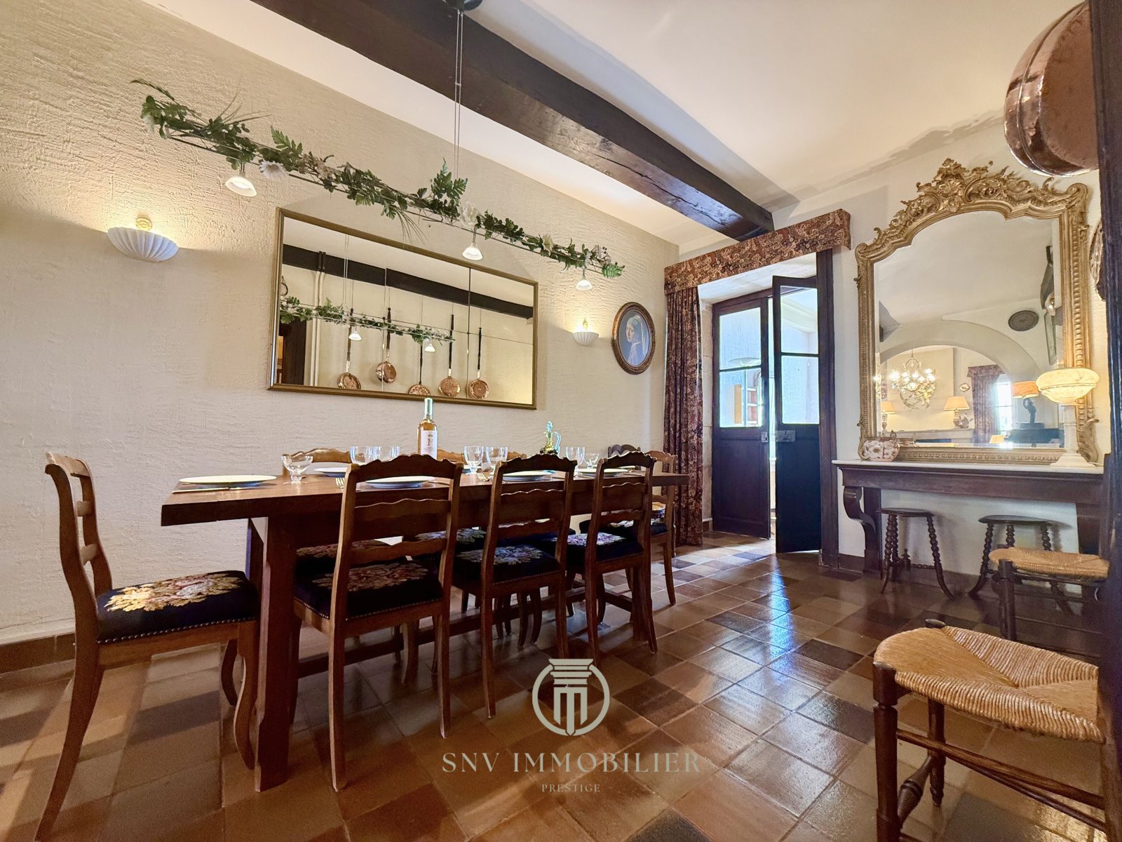 - une grande pièce de réception qui convient de salle à manger avec des poutres à la française, des tomettes de Bourgogne ainsi qu'une cheminée avec un manteau en pierres de taille dorées.