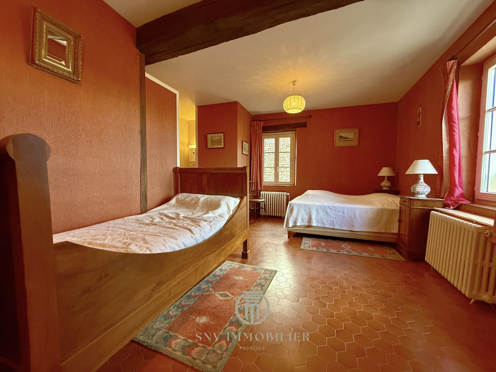 - on retrouve également une chambre très spacieuse avec tout le cachet de l'ancien : tomettes, manteau de cheminée en pierres dorées et poutres apparentes avec vue sur le bocage