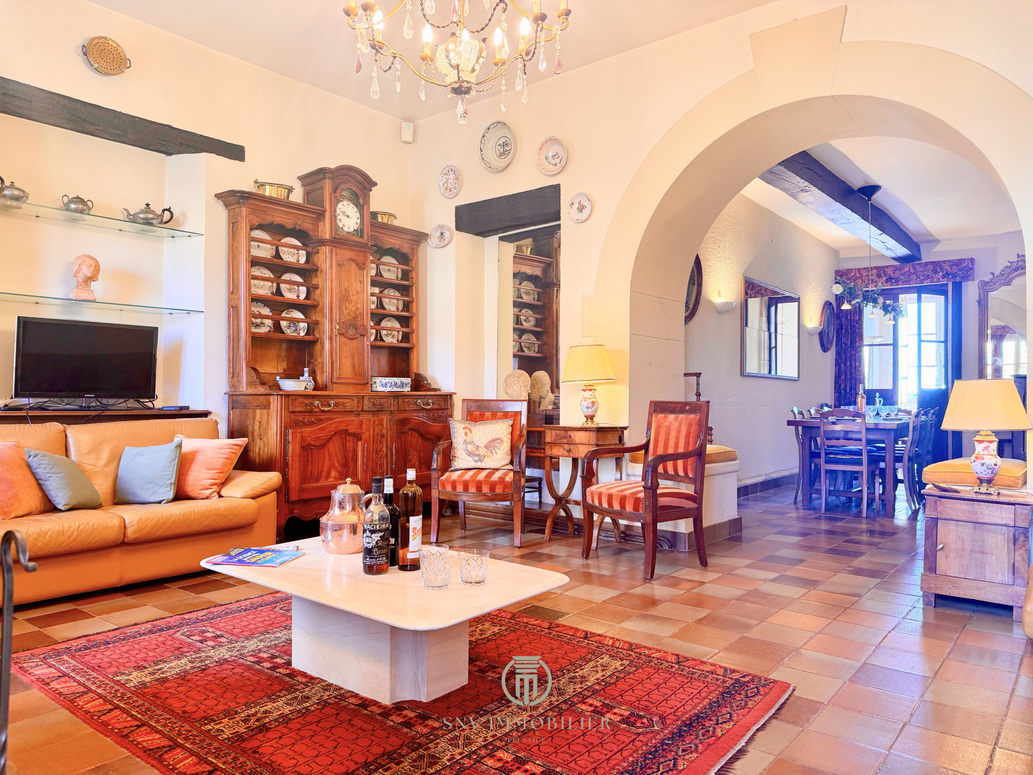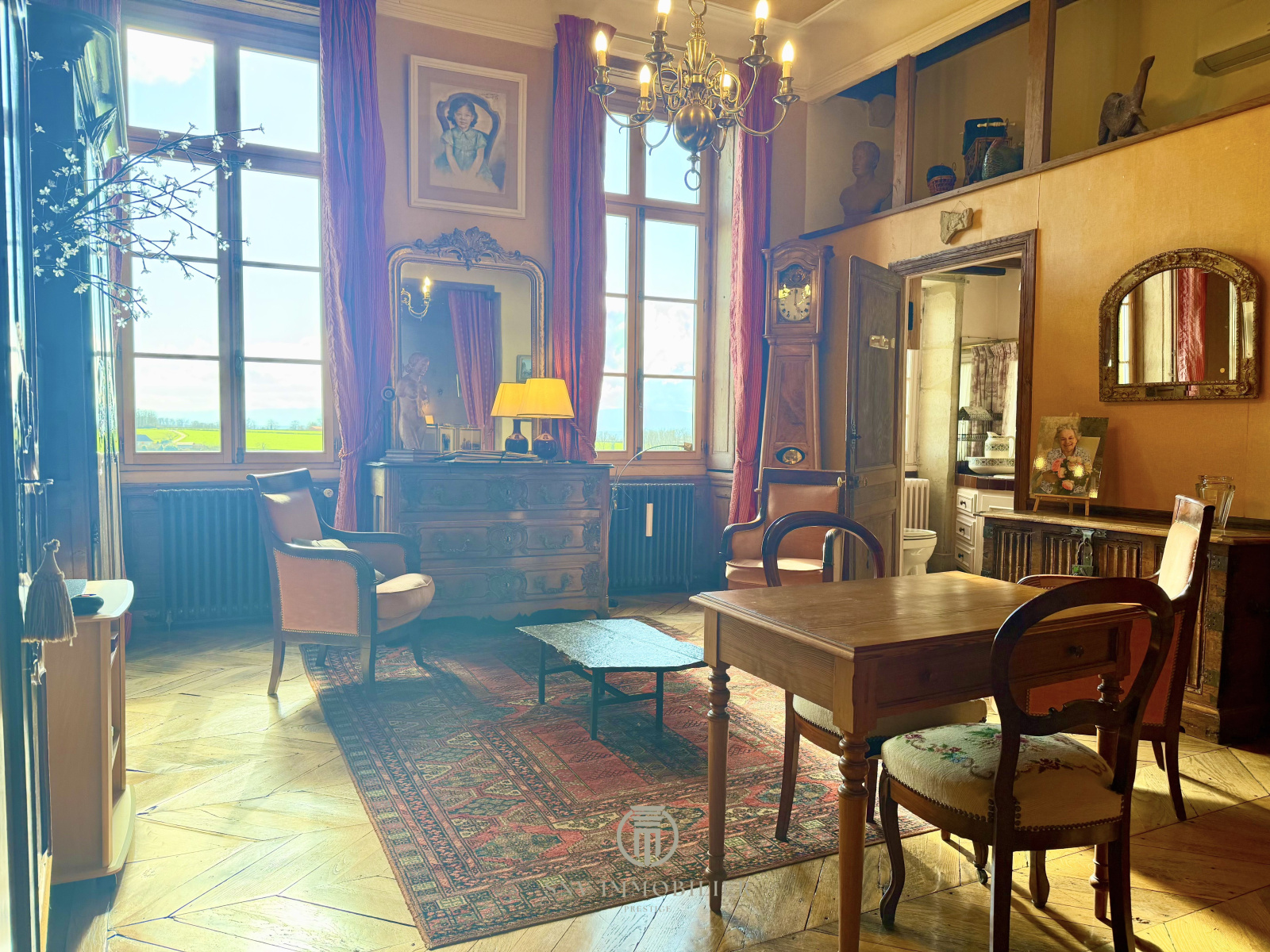 - un salon avec sol en tomettes, cheminée foyer ouvert et deux portes fenêtres donnant accès au balcon