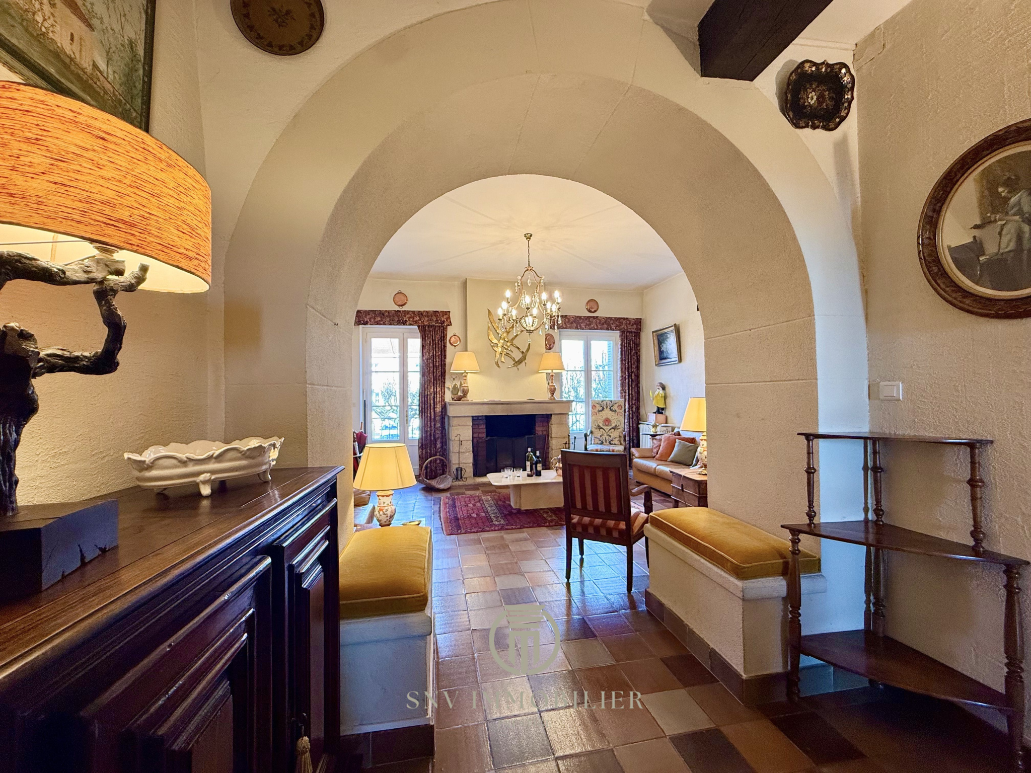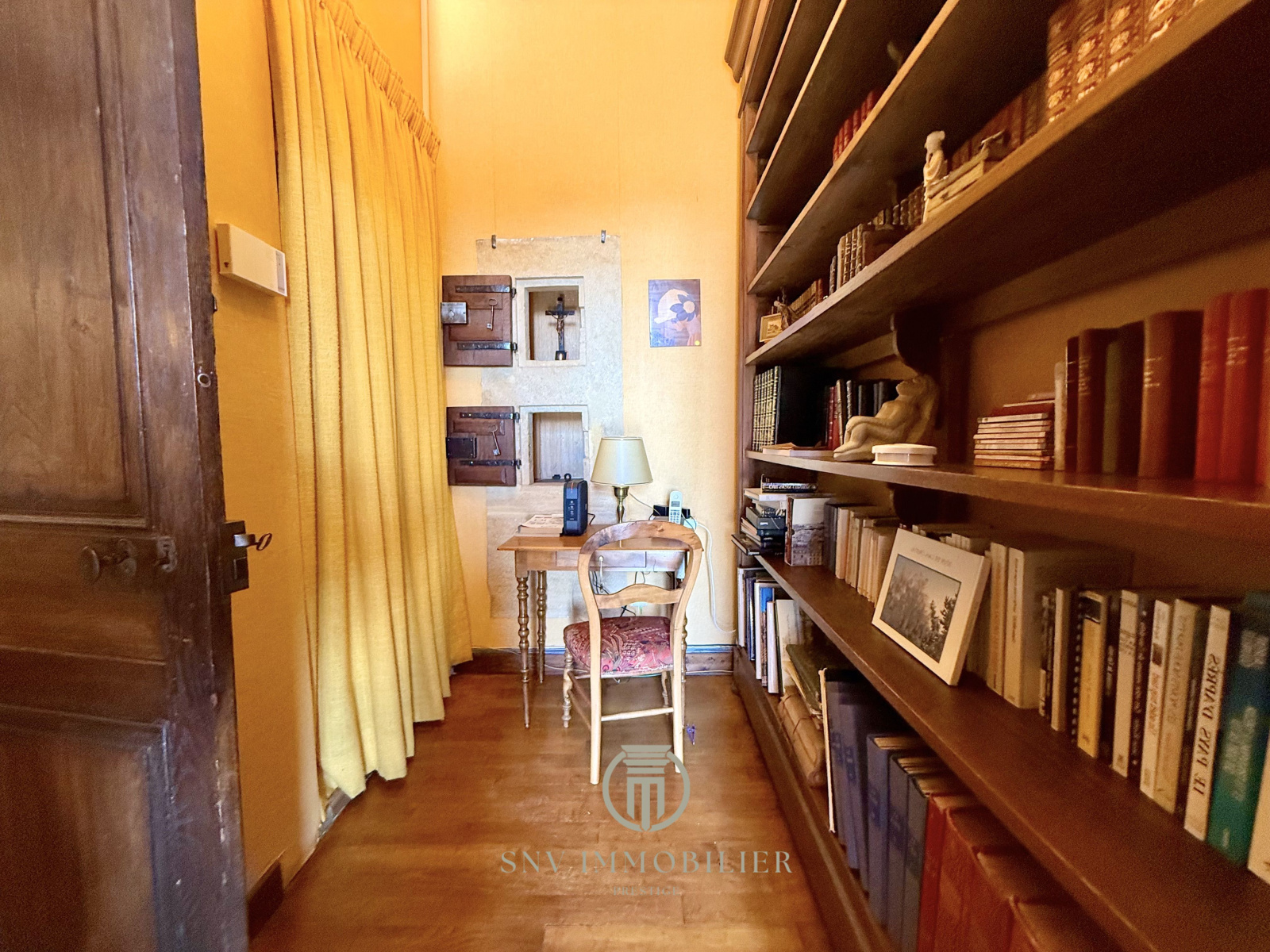 - une seconde pièce convenant de salon, bibliothèque qui a été une chapelle et bénéficie aujourd'hui d'une fenêtre cintrée, poutres apparentes et en son centre du parquet de Versailles et autour des tomettes octogonales