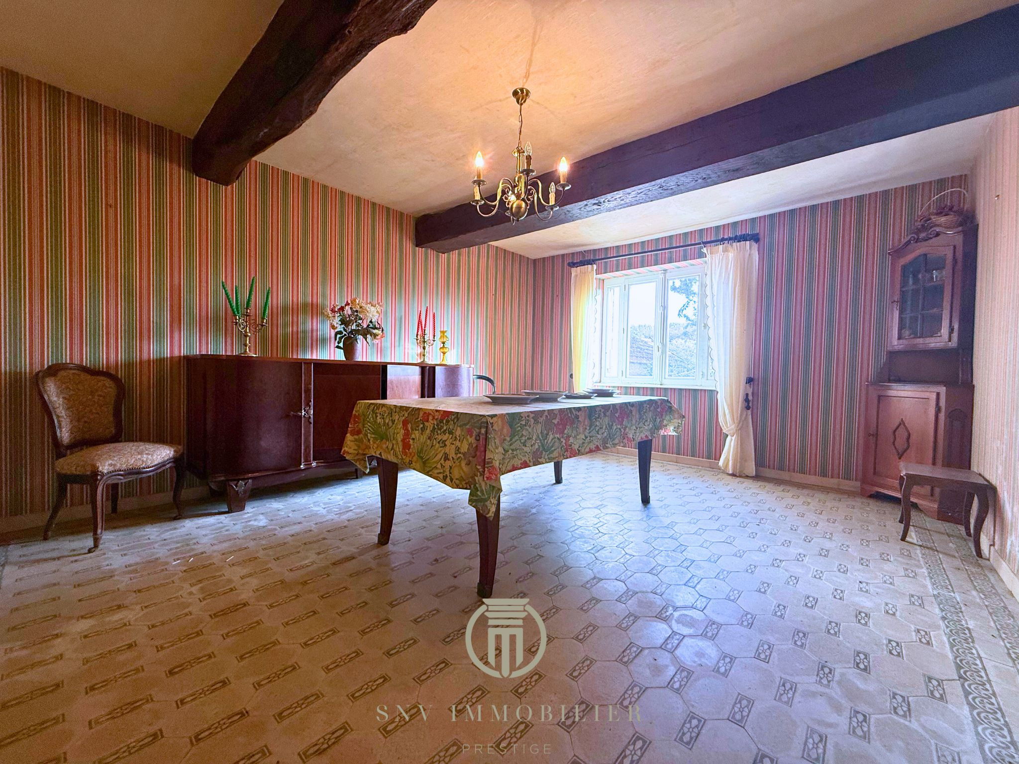- Une salle à manger avec des carreaux de ciment et placards intégrés ainsi que des poutres apparentes avec de grands ouvrants afin de bénéficier de la lumière naturelle