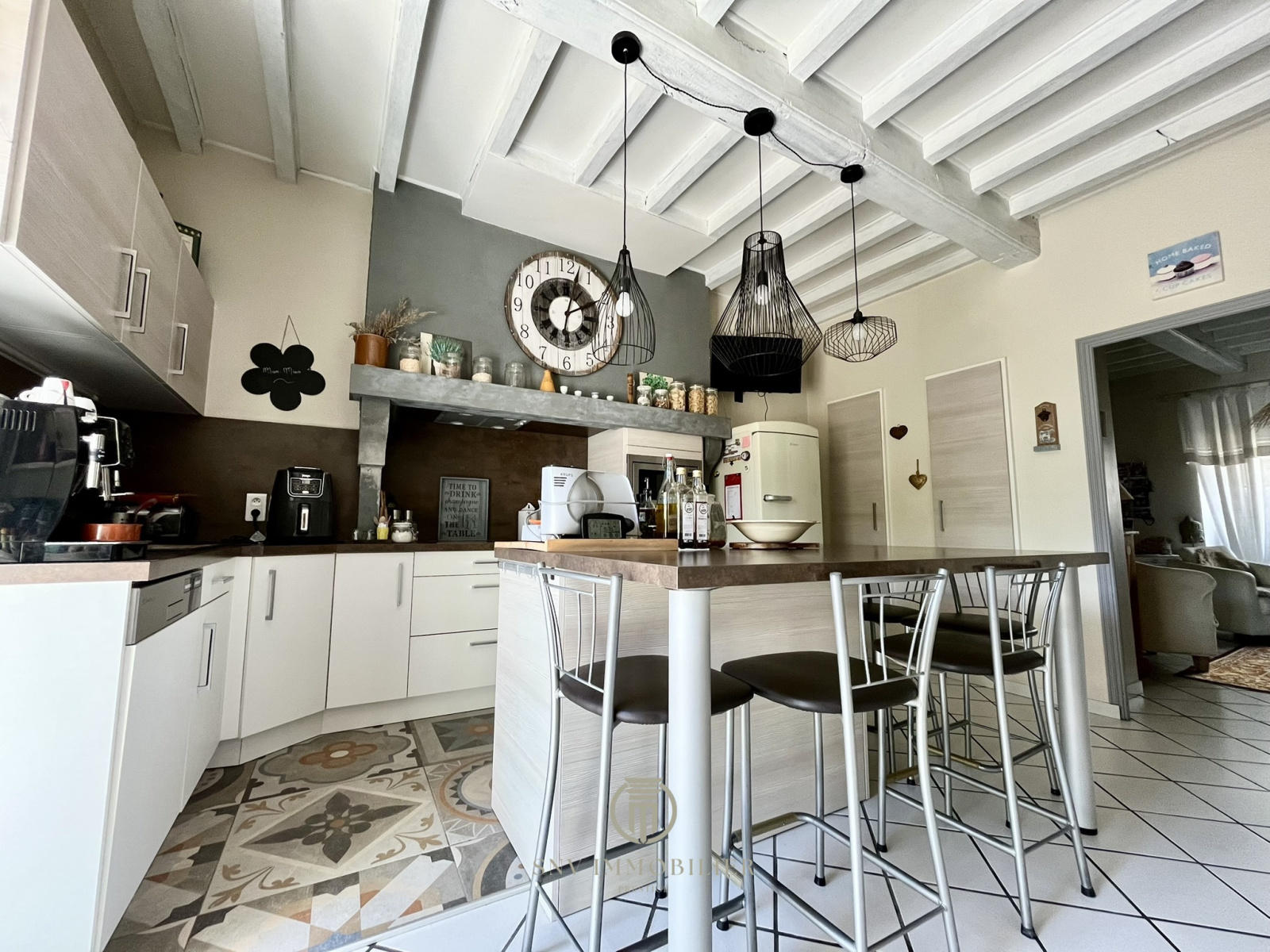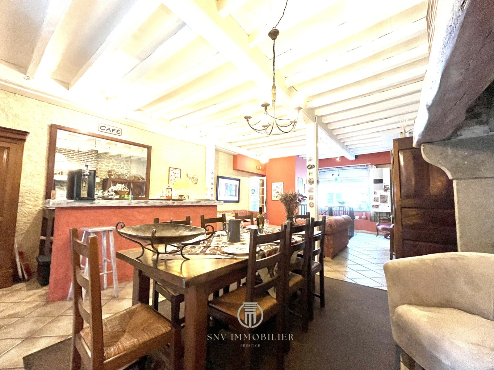 - Salon avec bar – salle à manger avec ancienne cheminée et plafond à la française