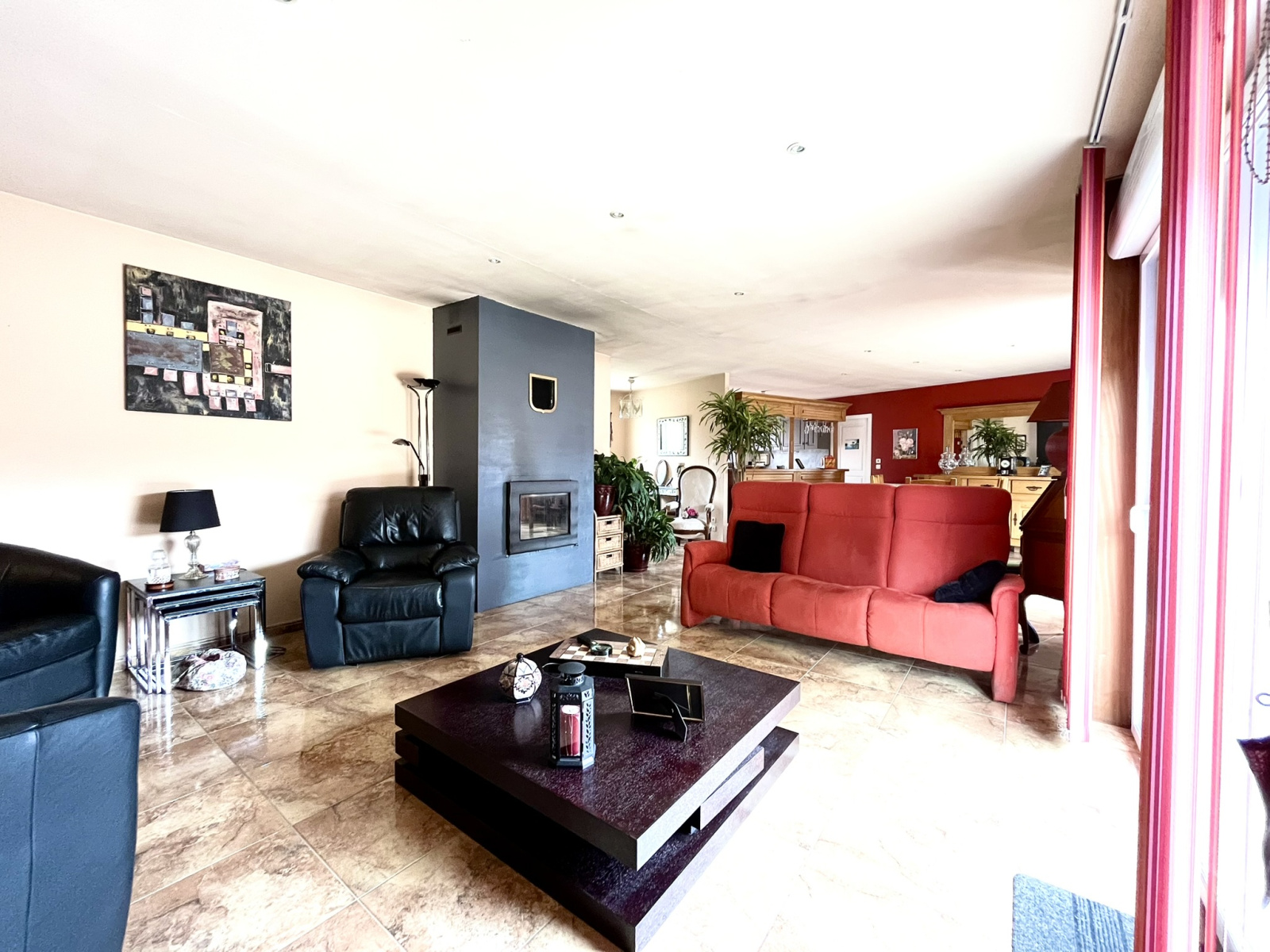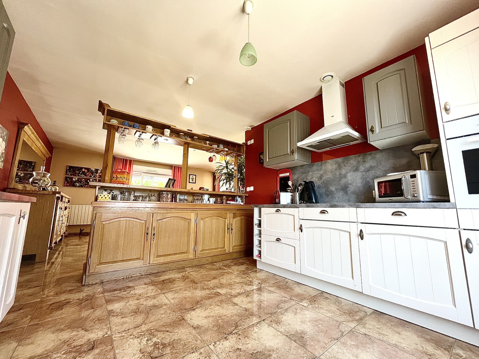 - Une cuisine équipée et agencée d’un grand bar ouvert sur une vaste pièce de vie lumineuse comprenant salle à manger et salon,