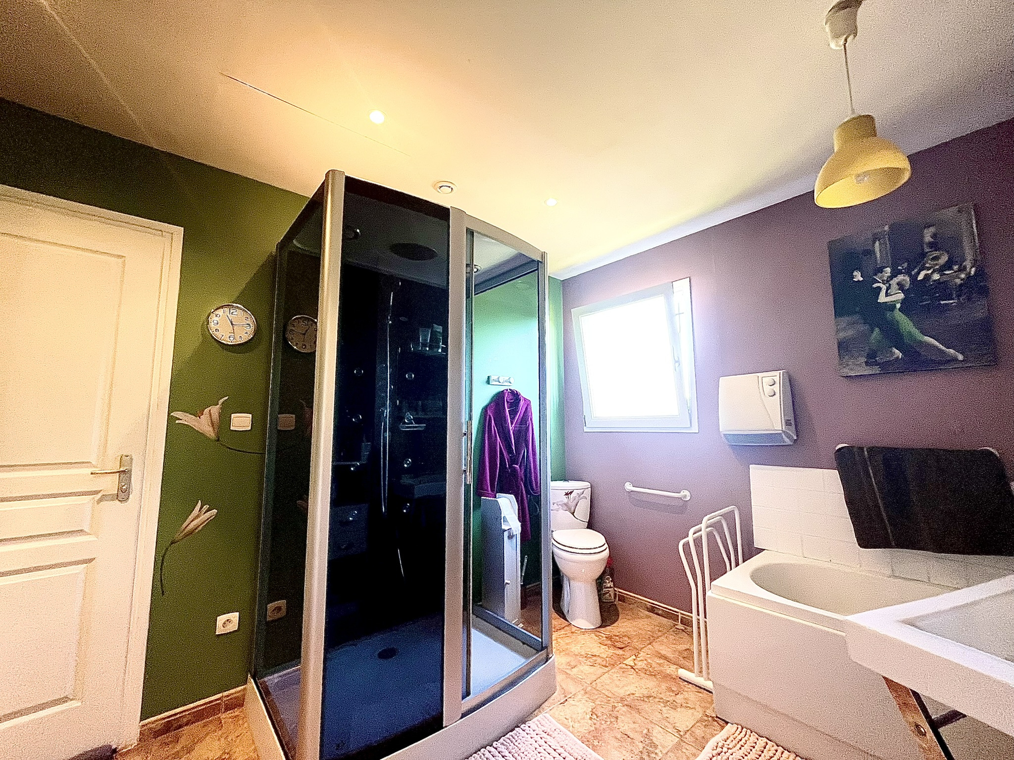 - Une grande salle de bain équipée d’une baignoire et d’une douche, wc