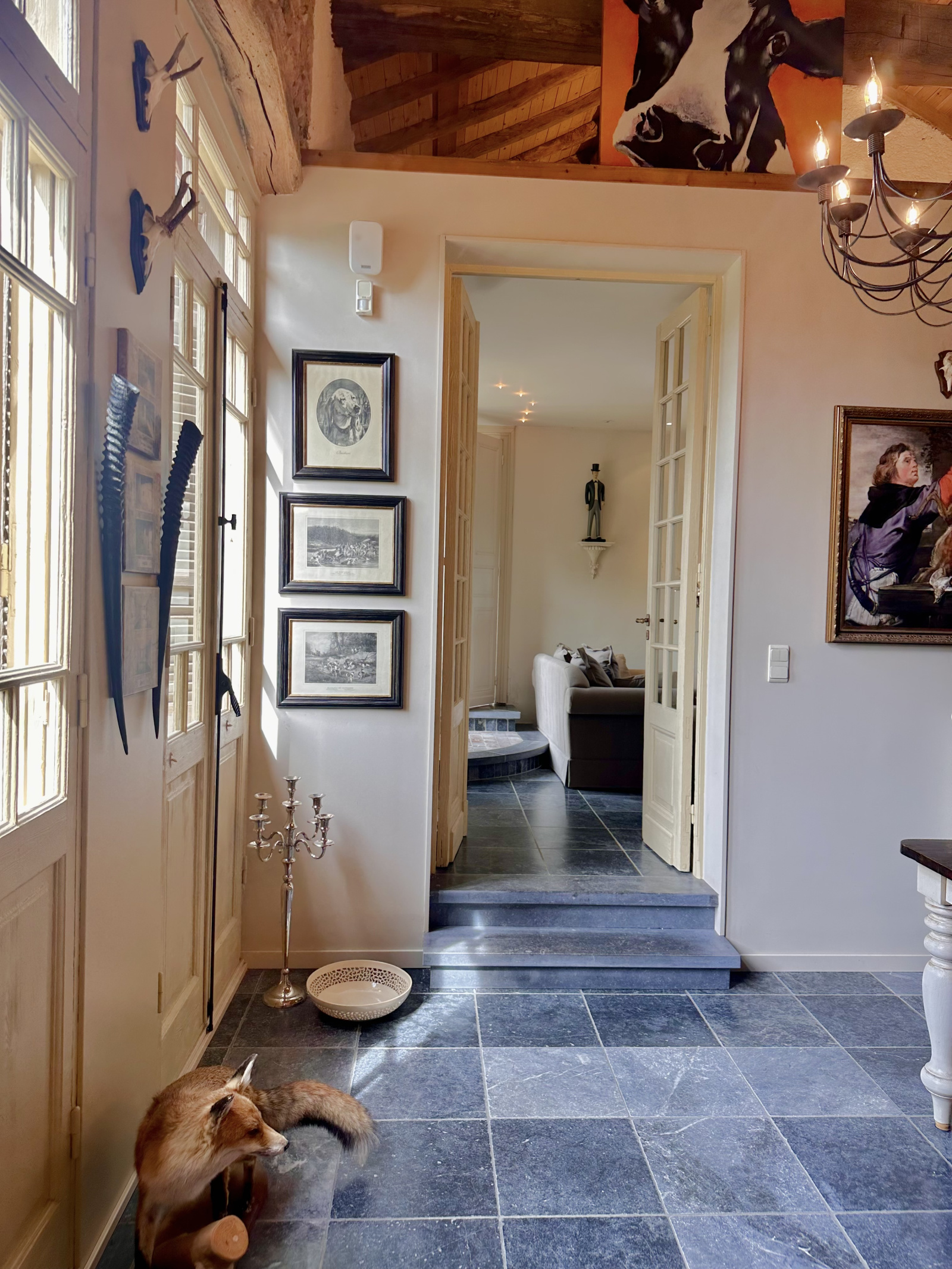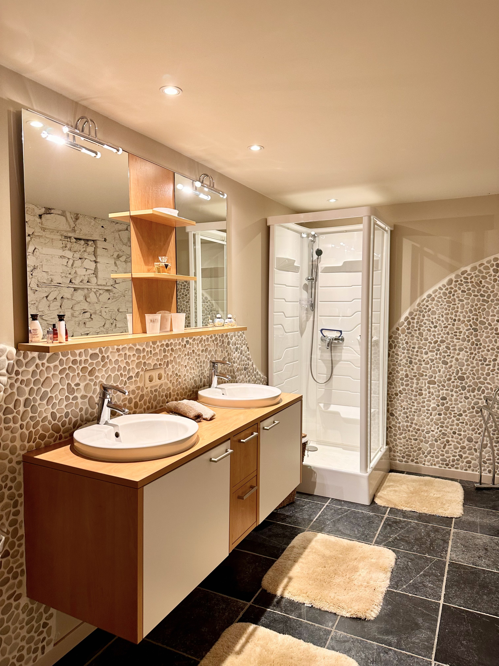 Les matériaux nobles sont mis en valeur, notamment par les carrelages en pierre bleue de Belgique, reflétant le souci du détail et de la qualité de cette rénovation.