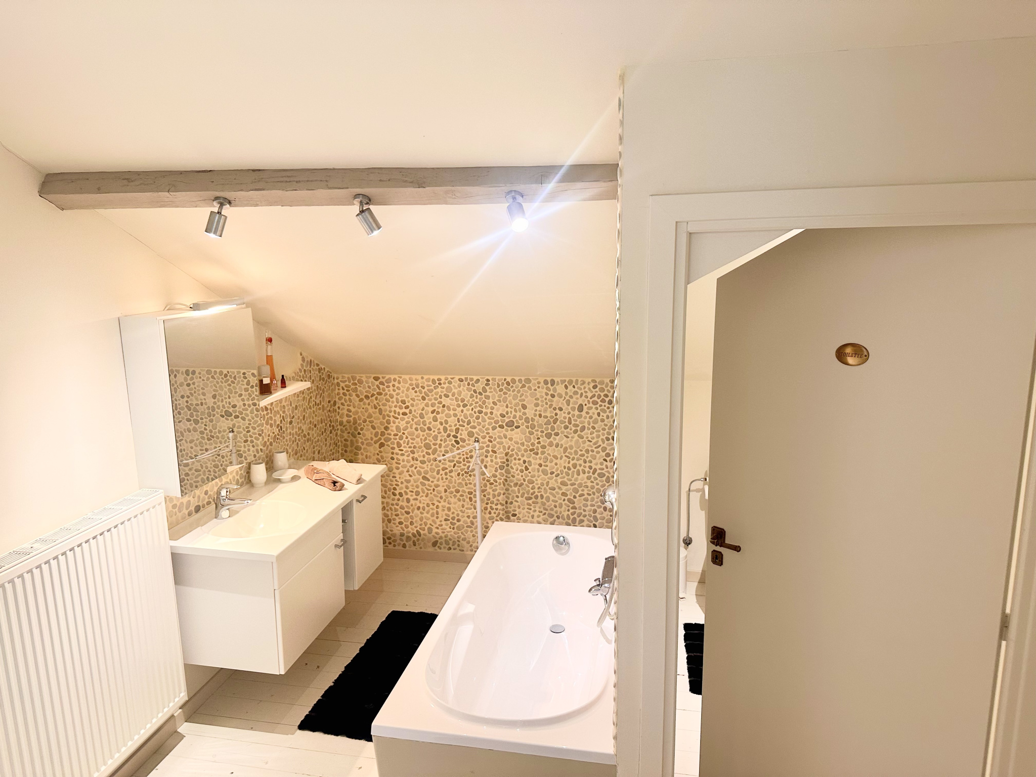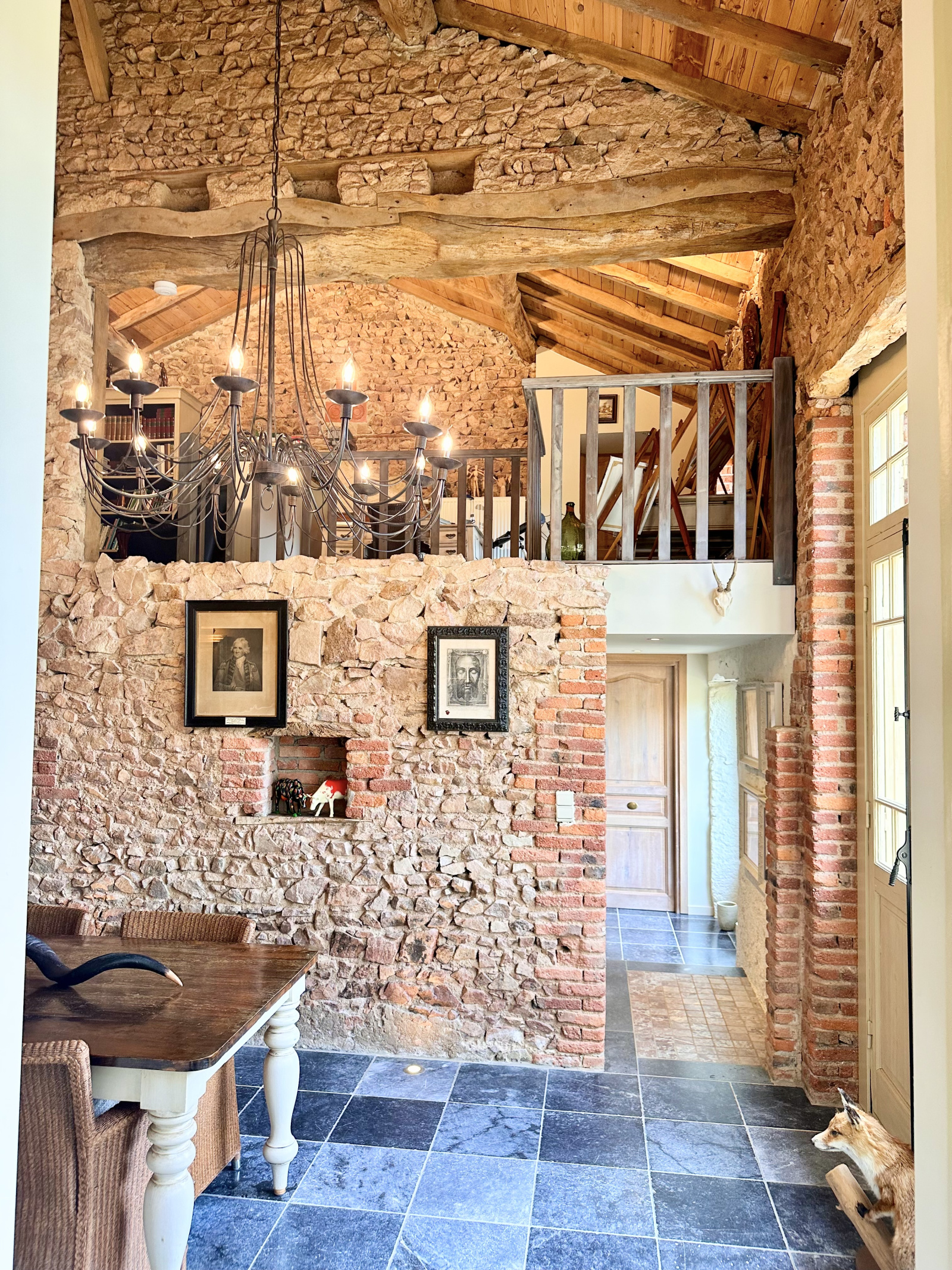 Rénovation complète tout en préservant son identité avec pierres et poutres apparentes, offrant un mélange harmonieux entre l'ancien et le moderne.