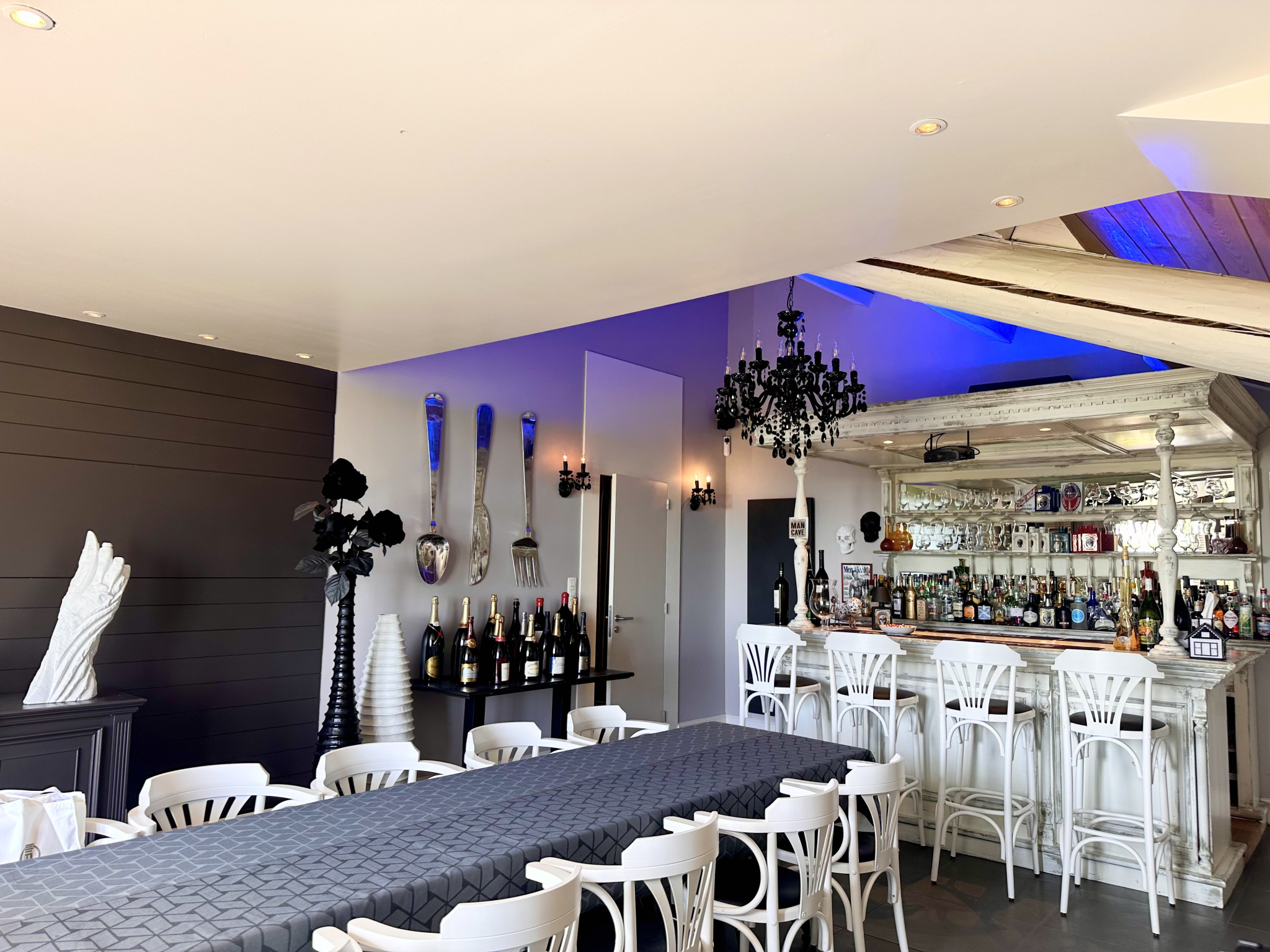 Au rez-de-chaussée, vous trouverez une entrée avec une cuisine entièrement équipée et une arrière-cuisine, un salon, une salle à manger, une première suite parentale avec douche et WC, un espace buanderie, un bar privatif avec salle à manger, ainsi qu'un espace traiteur/cuisine avec un four à pizza et un WC.